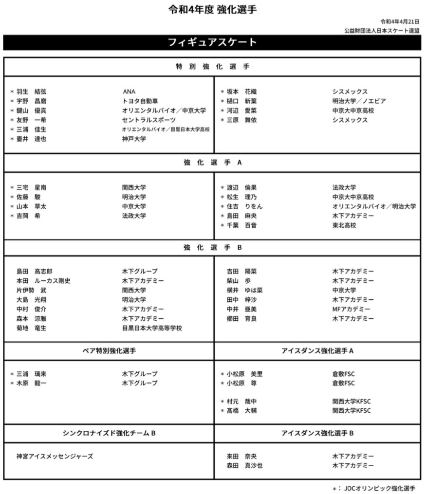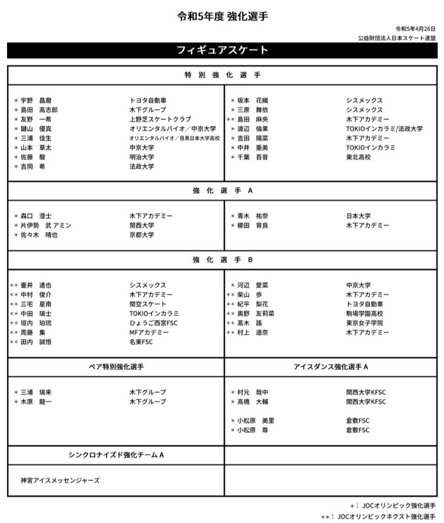 そしてスケ連は令和5年度の強化選手を発表し、特別強化選手のあまりに多い選出にびっくりしたわ。